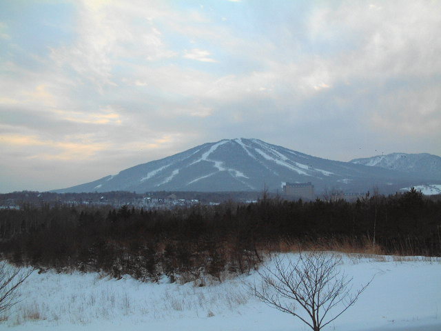 遠景の安比高原スキー場。コースが白いラインになっています。