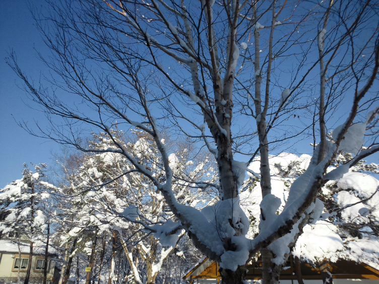 今朝は、無風で青空が広がり、真っ白な雪が輝いています。