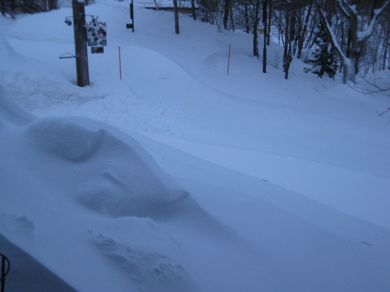 吹き溜まりの新雪は、1m以上