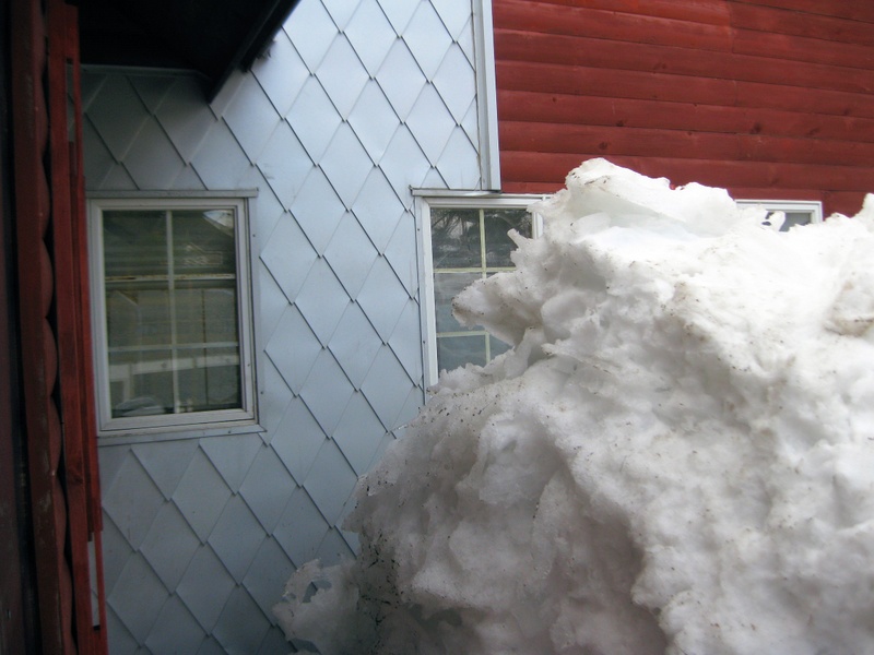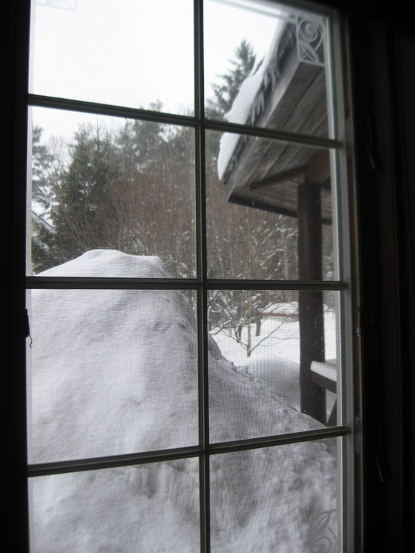 積もった雪を足掛かりにして、窓の雪よけ板を外しました。