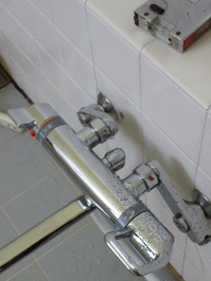 なんと、お風呂の混合水栓を丸ごと交換!! (水平に取り付けるのに四苦八苦。)