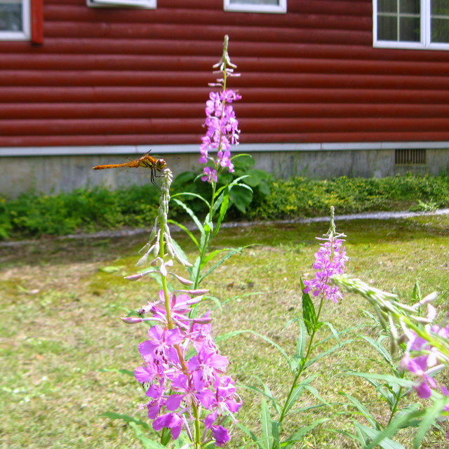 咲き始めたばかりの、ヤナギランの先端にトンボ・・・