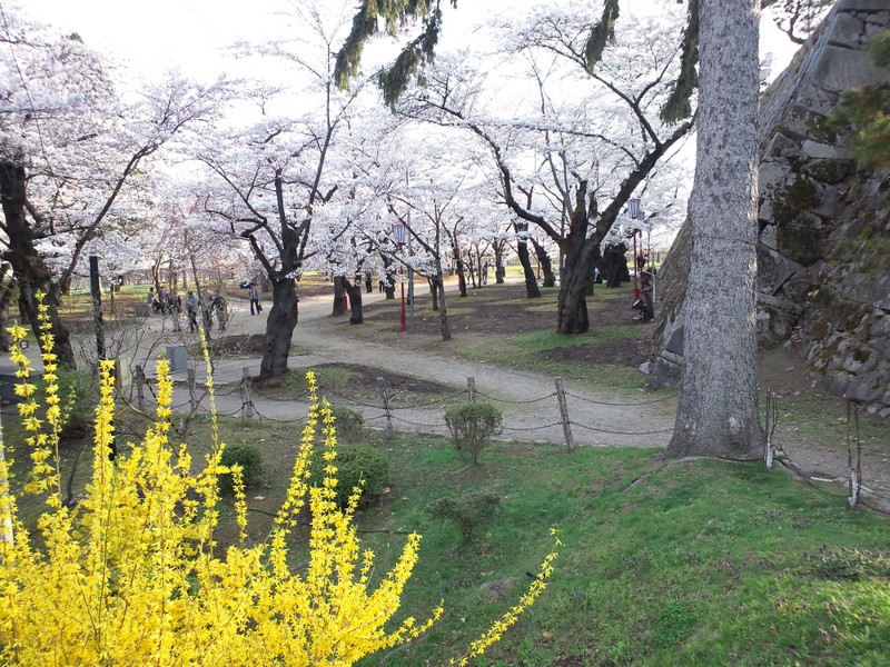 桜の花と石垣、レンギョウのコントラストが綺麗