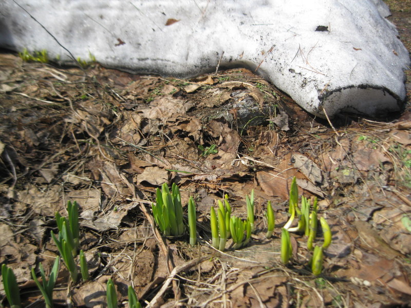 雪どけ間もない庭を巡ると、ウド、コシアブラ、タラノメ、行者にんにく等