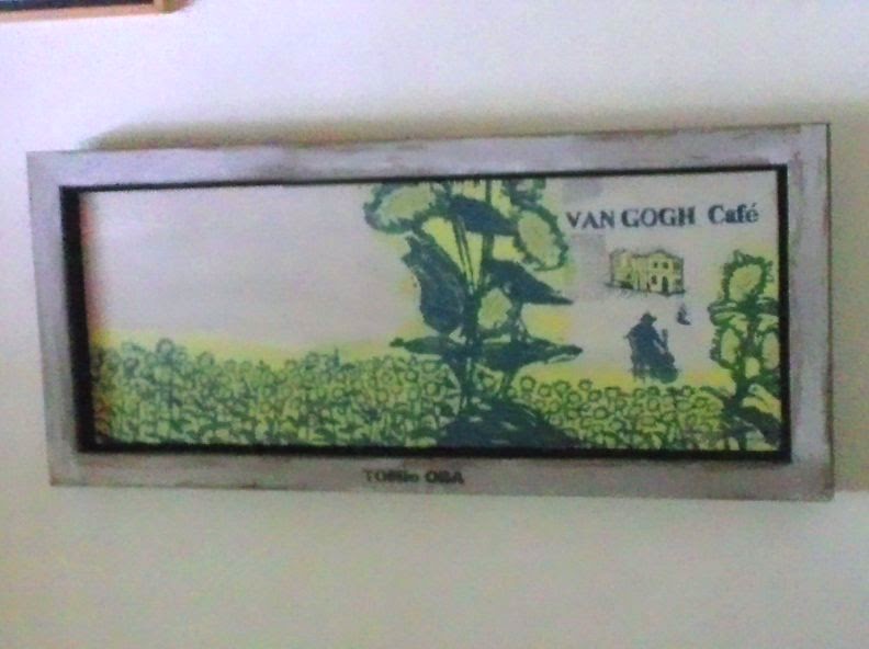 階段の踊り場に、版木に直接掘り込んだひまわりベースの作品。