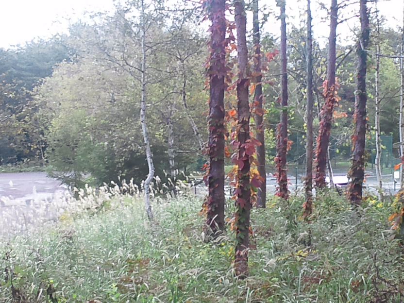 ベランダからふと見たら、赤松に絡まった蔦の紅葉が始まっていました。