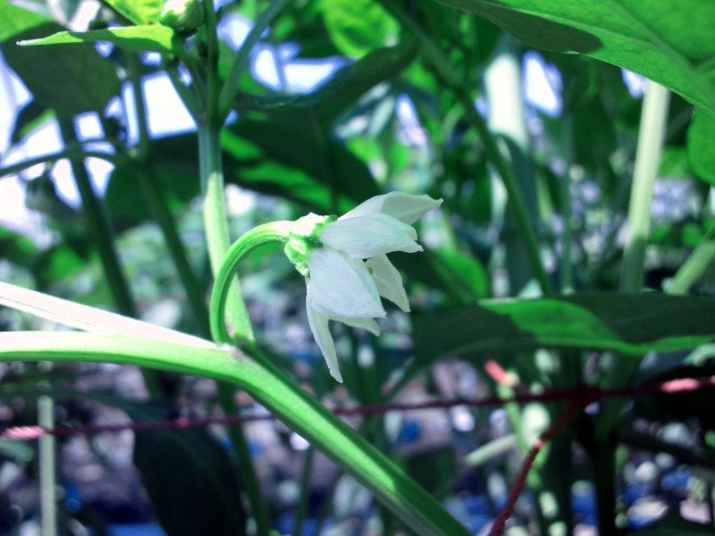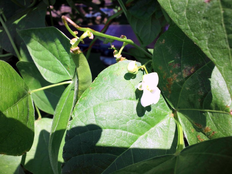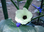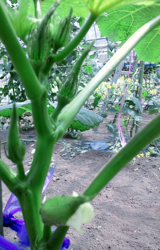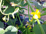 朝のうちに友人の畑に行ってきました。 左から、きゅうり、インゲン、ピーマンの花です。