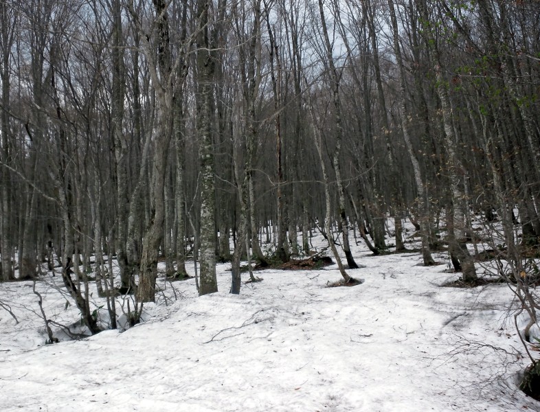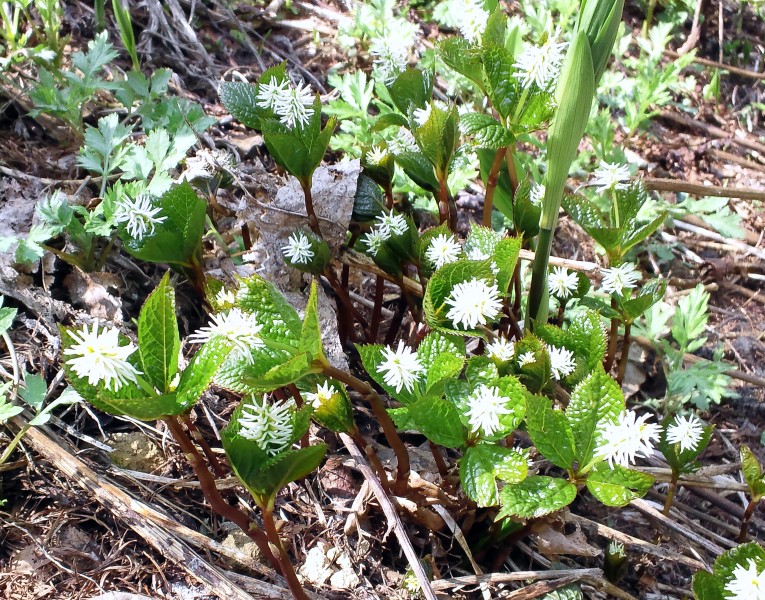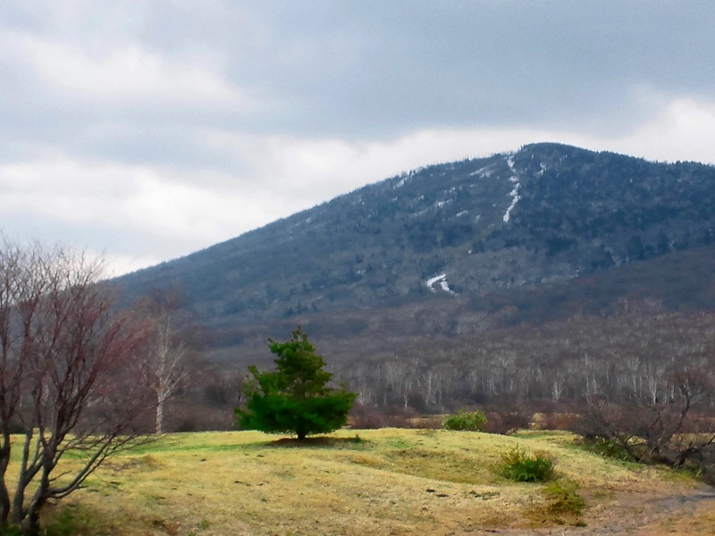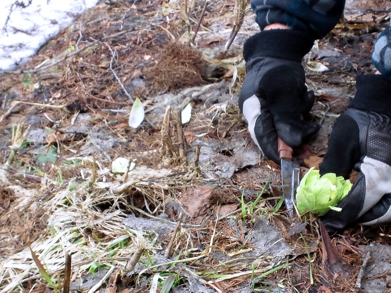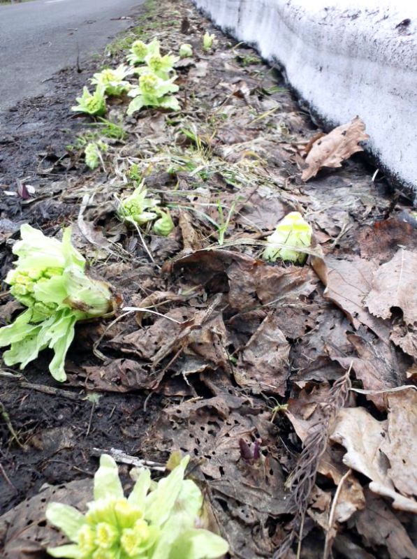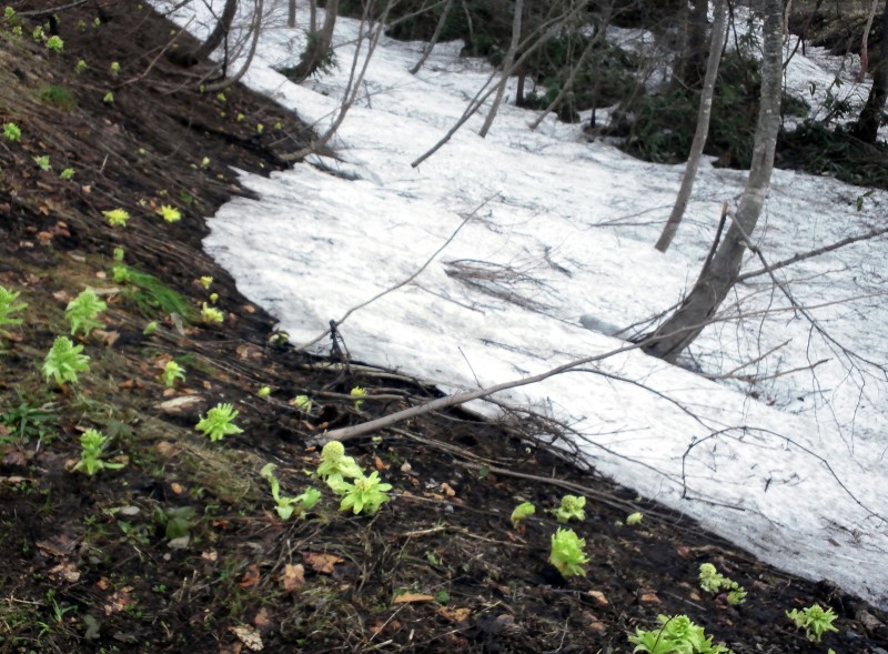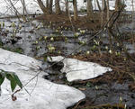 雪どけの湿地帯に、水芭蕉が白く目立ってきました。