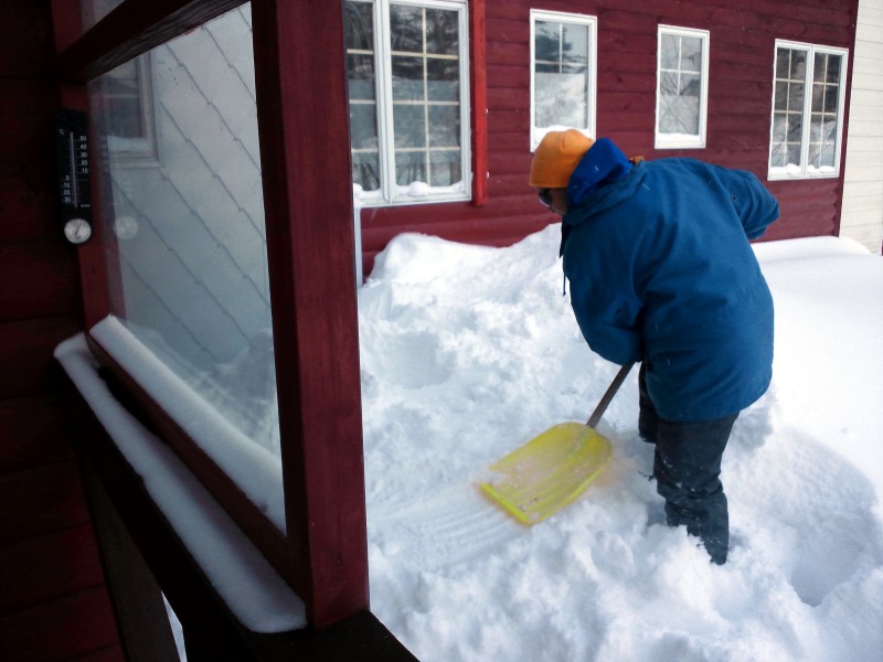 屋根から落ちる雪を予測して、下に積もった雪を片付ける作業中。