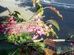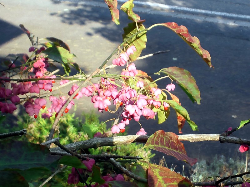 玄関前のマユミの木、ピンク色の実が日に日に色を変えています。