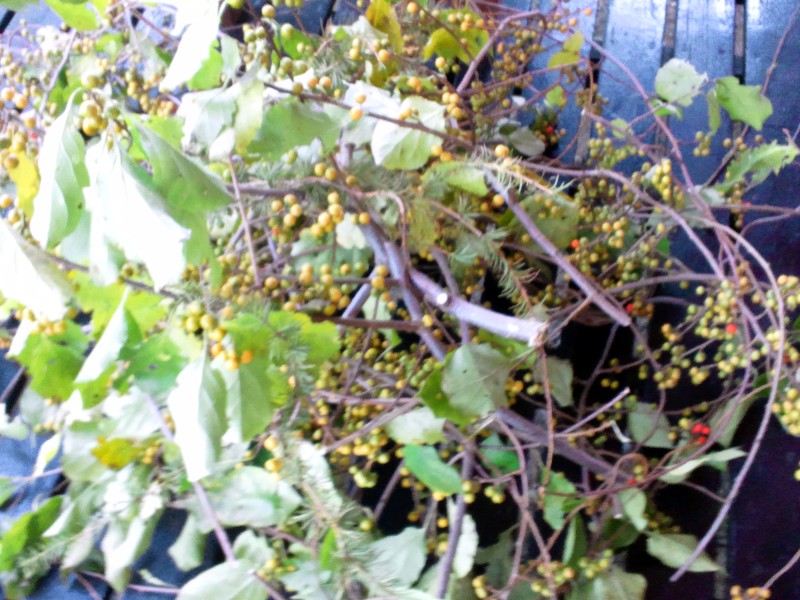 乾燥しても実が落ちません。玄関の花瓶のツルウメモドキ今年の入れ替え完了。