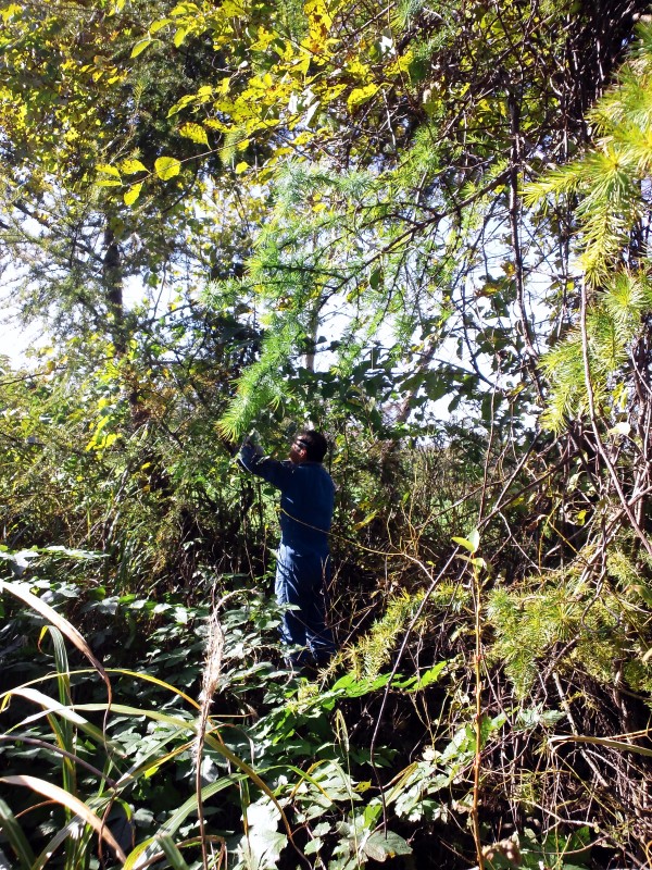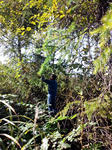 つなぎの作業服に手袋で木に絡んだツルウメモドキを採ります。