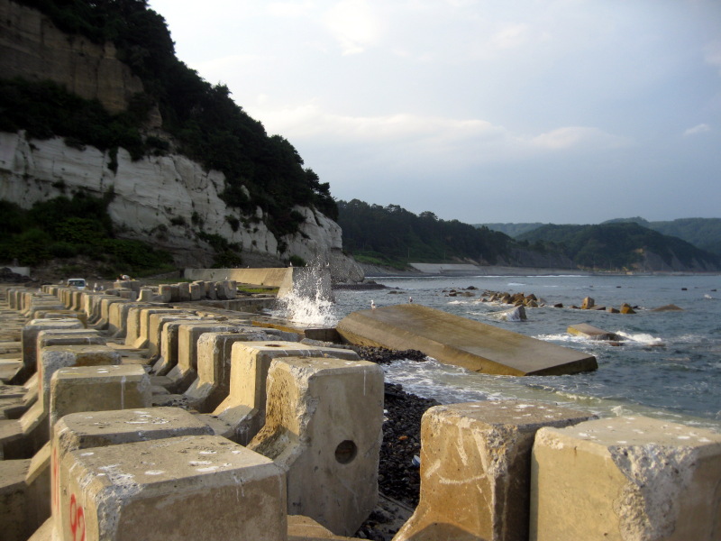 高さ3m近くの防波堤が津波で倒され、景色が一変。津波の破壊力は想像を超えます。
