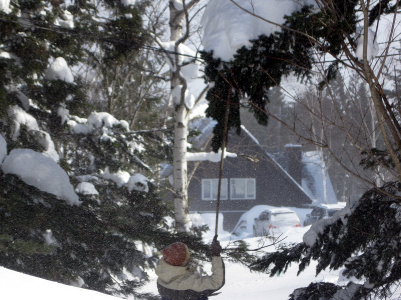 スノーシュー(洋かんじき)に脚立と長い棒を用意して